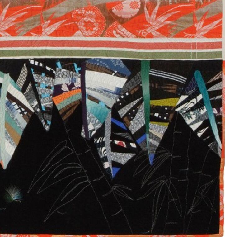 This one-of-a-kind artwork features bands of vermilion kimono fabric at the top and bottom, with a central panel of handmade paper adorned with hand-painted calligraphy and gold powder. Machine quilting in leaf motifs decorates the upper and lower sections. The design expresses a quiet yet uplifting energy—like joy welling up from the center and expanding outward, as leaves flourish in harmony.