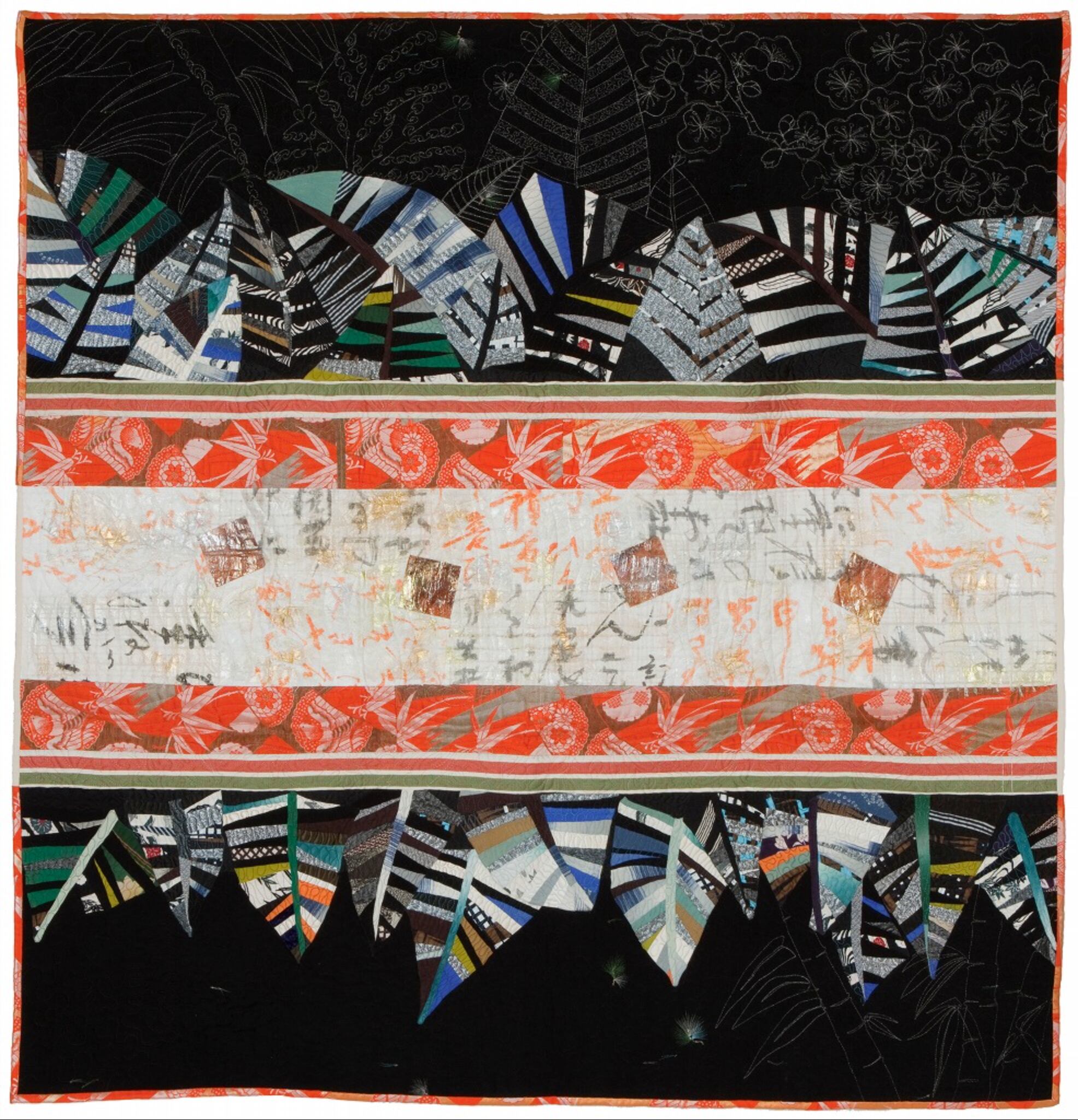 上下に朱色の帯地を配し、中央には手書きの文字と金粉を施した手漉き和紙を貼り合わせています。上下には葉をモチーフにしたミシンキルティングを施しました。中央から周辺へと広がるように、慶びごとが湧き出し、葉が茂り盛んになるような静かなエネルギーを表現した一点もののアート作品です。