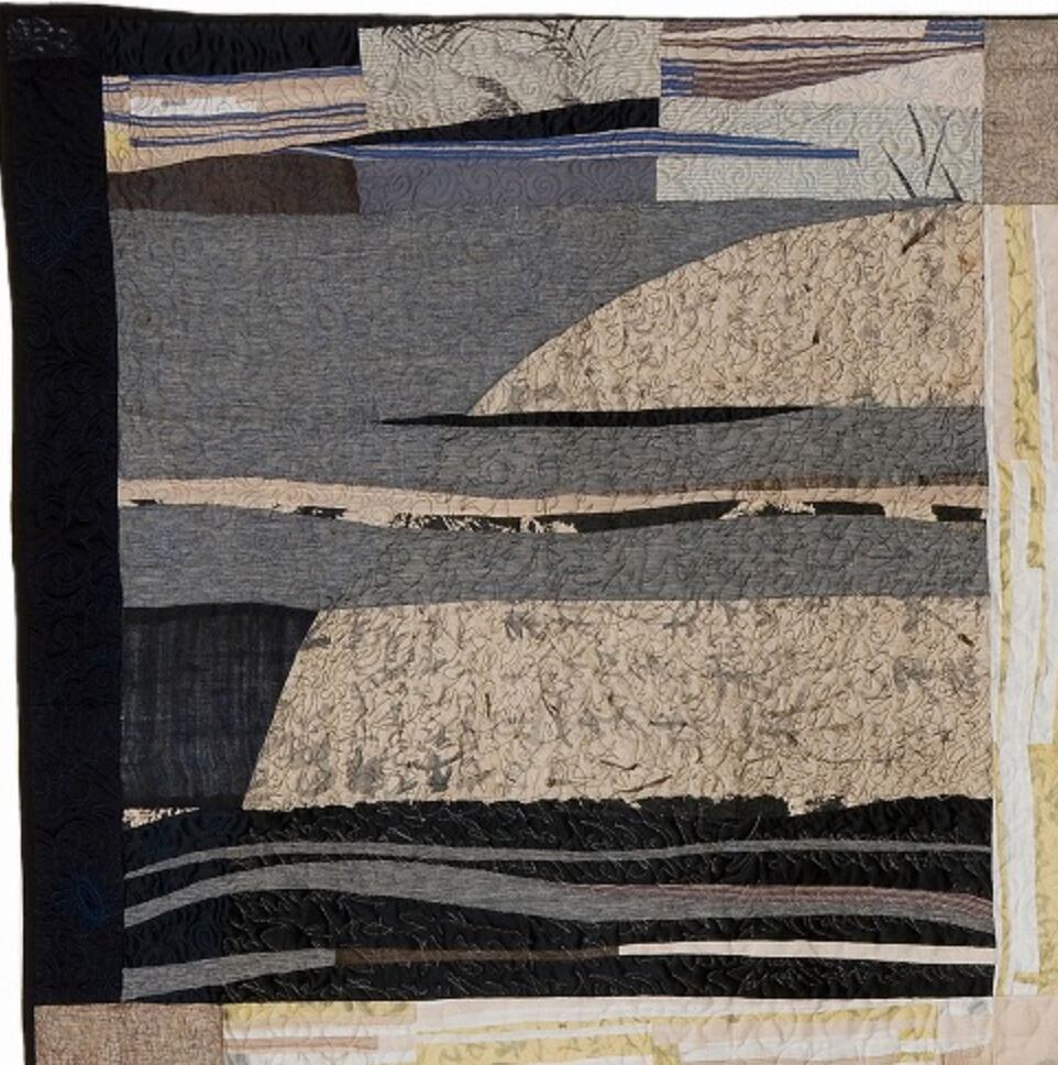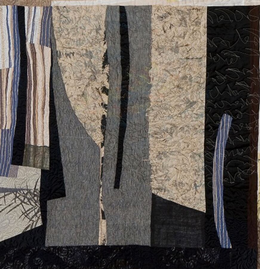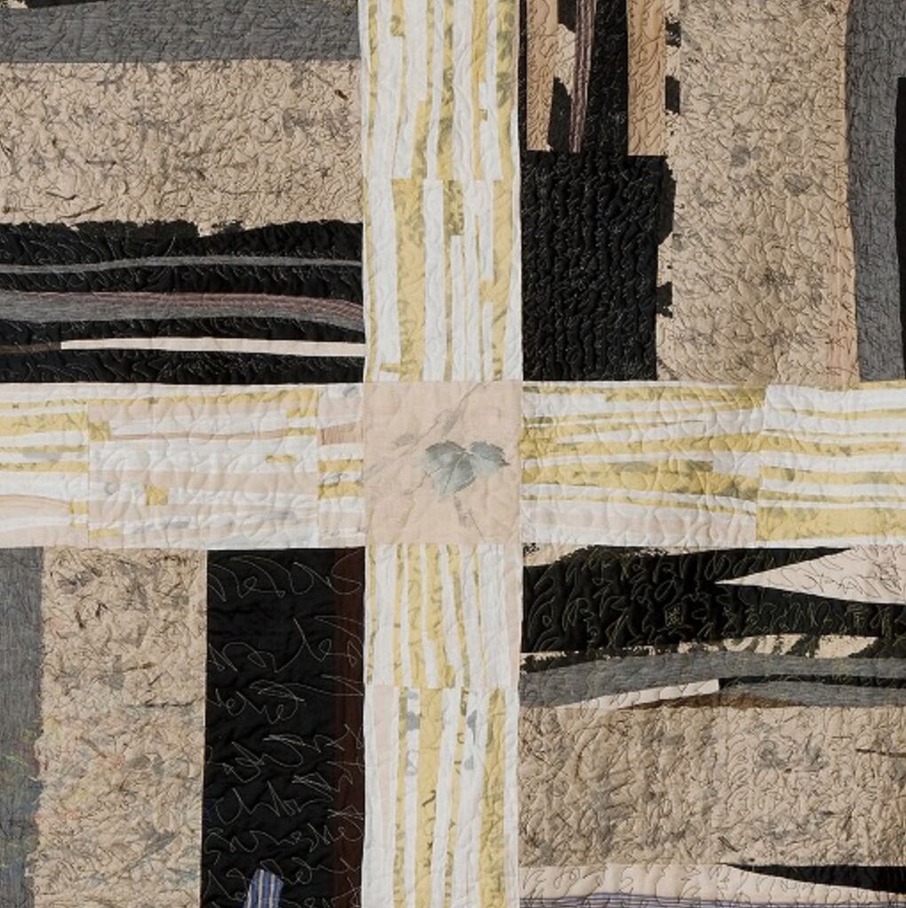 日本の文字「いろは」をモチーフに、ミシンキルティングで流れるように縫い込みました。十文字と丸い円を組み合わせることで、侘び寂びの世界観を表現しています。布の質感とステッチのリズムが調和し、静けさの中に深い美しさを感じさせる一点もののアート作品です。